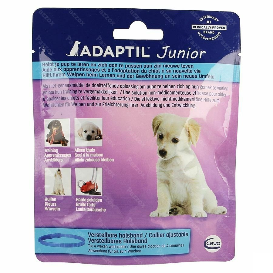 ADAPTIL Junior Halsband is een anti-stress product voor puppies op feromonenbasis. Het bevat een analoog van de natuurlijke kalmerende feromoon (Dog Appeasing Pheromone – DAP) die door zogende moederhonden wordt afgescheiden. Dit halsband helpt puppies vertrouwen te krijgen en zich goed te voelen in hun nieuwe omgeving, vooral bij training, socialisatie, huilen, alleen zijn en harde geluiden. Het biedt een gevoel van veiligheid en welzijn voor een ontspannen puppy.