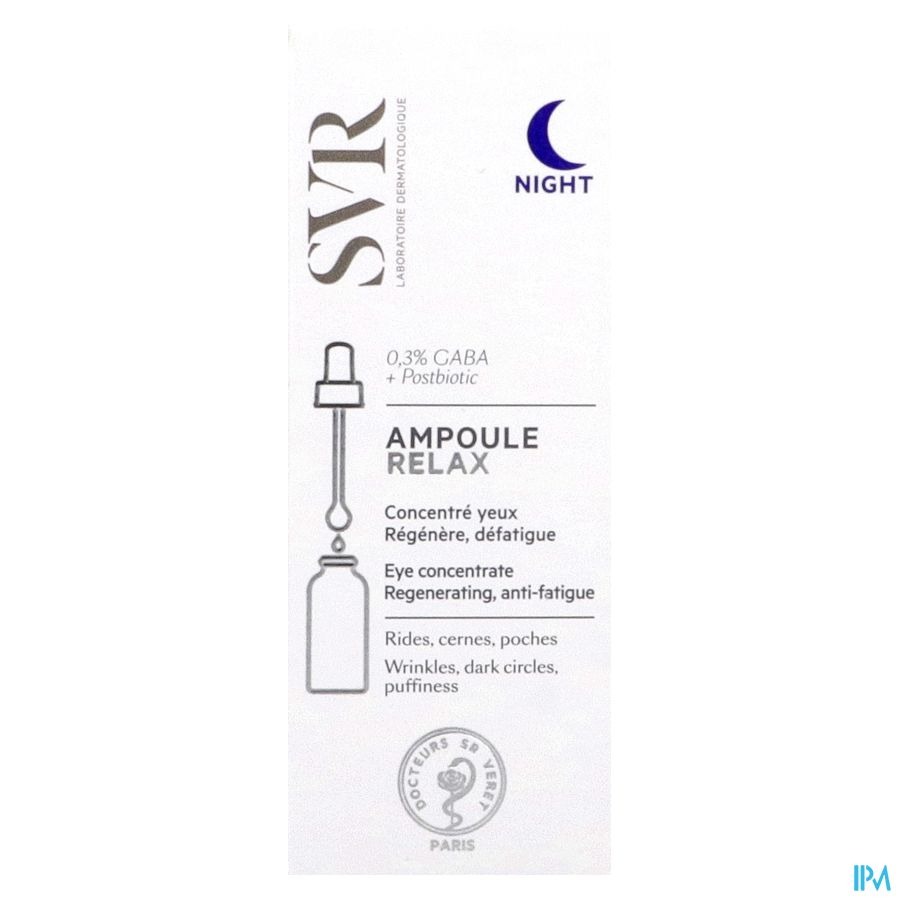 De Ampule relax kalmeert, ontspant en bevordert de regeneratie van de oogcontouren. De exclusieve formule, verrijkt met Gaba, werkt huidrelaxerend en maakt de huid gladder en strakker, de ogen worden ontspannen en rimpels en fijne lijntjes worden zichtbaar gladgestreken. Aangevuld met een post-bioticum, zal deze formule, in combinatie met massage, de microcirculatie bevorderen om donkere kringen en wallen aanzienlijk te corrigeren.