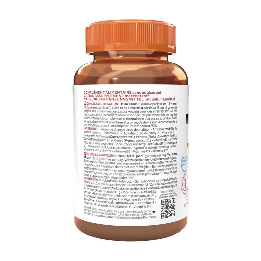 Vulstof: maltitolstroop - Gemodificeerd aardappelzetmeel - Vitamine C - Zuurmiddel: citroenzuur - Vitamine B3 - Concentraten van wortel (Daucus carota L.), appel (Malus domestica Borkh.), zwarte bes (Ribes nigrum L.) en kers (Prunus cerasus L.) - Vitamine E - Natuurlijke aroma's - Plantaardige oliën: kokosnoot (Cocos nucifera L.) en koolzaad (Brassica napus L.) - Vitamine B6 - Zoetstof: sucralose - Glazuur. ) - Vitamine E - Natuurlijke aroma's - Plantaardige oliën: kokosnoot (Cocos nucifera L.) en koolzaad (Brassica napus L.) - Vitamine B6 - Zoetstof: sucralose - Glansmiddel: carnaubawas - Vitamine A - Vitamine B9 - Vitamine B8 - Vitamine D3 - Vitamine B12.