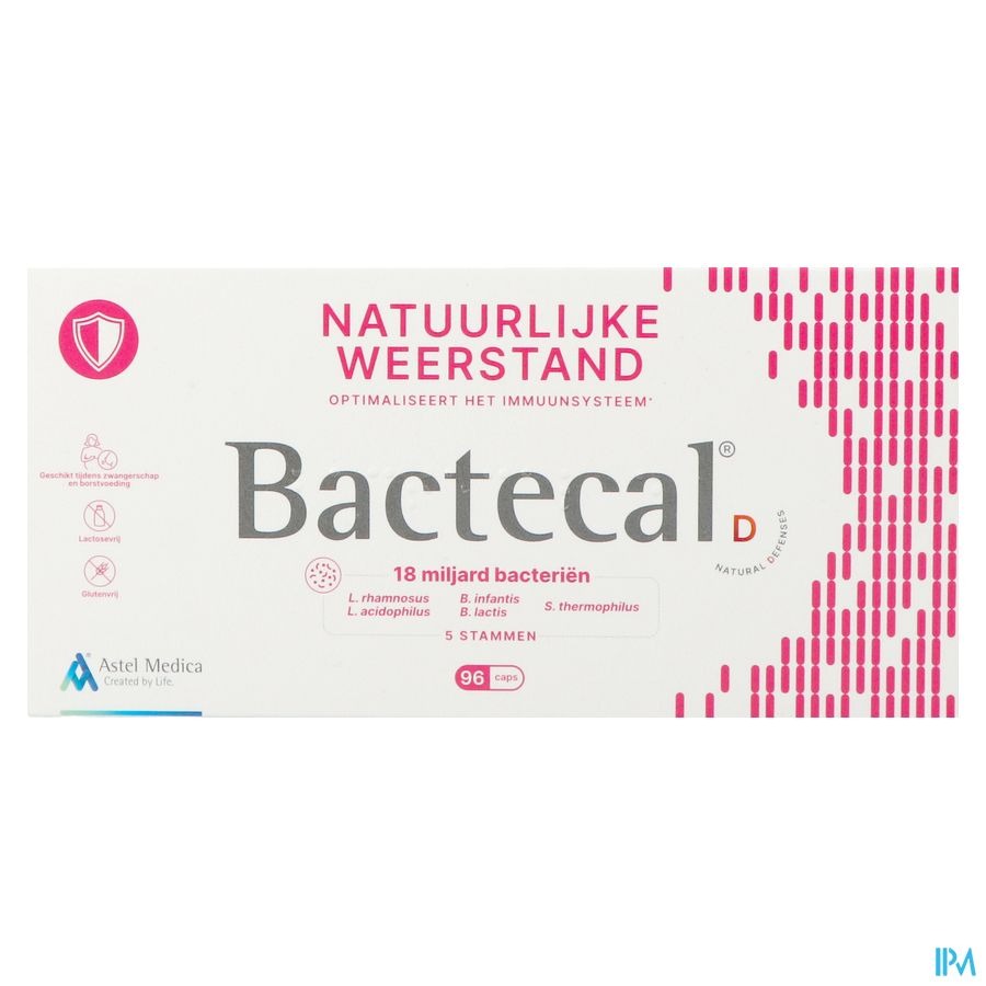 Bactecal D is een voedingssupplement en bevat 3 bacteriefamilies: Lactobacillus, Bifidobacterium en Streptococcus thermophilus. De concentratie aan bacteriën van Bactecal D is 18 miljard per capsule. Gezien de gevarieerde samenstelling, de ideale concentratie en de intrinsieke eigenschappen van elk bestanddeel heeft Bactecal D een zeer breed spectrum van toepassingen bij volwassenen en kinderen vanaf de geboorte.
