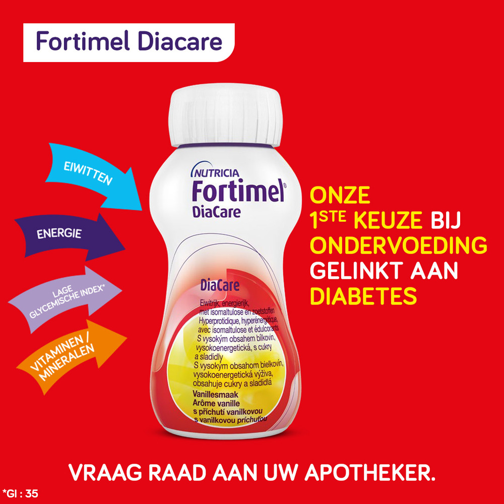 Fortimel® DiaCare is een voeding voor medisch gebruik. Dieetvoeding bij ziektegerelateerde ondervoeding bij patiënten met diabetes mellitus of hyperglycemie. Te gebruiken onder medisch toezicht.