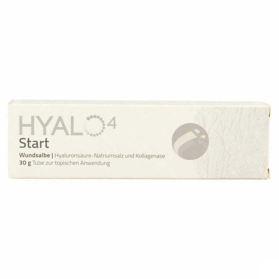 - HYALO4 START is een vloeibare zalf voor lokaal gebruik met als hoofdbestanddeel hyaluronzuur natriumzout verkregen door bacteriële fermentatie, en als bijgevoegde medicinale stof, bacterieel collagenase verkregen uit een niet-pathogene stam van Vibrio alginolyticus.