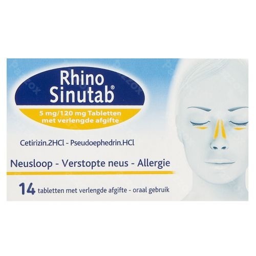 RhinoSinutab helpt bij de behandeling van symptomen zoals een verstopte neus, niezen, loopneus en jeukende neus en ogen die veroorzaakt worden door een seizoensgebonden en niet-seizoensgebonden allergische rhinitis. RhinoSinutab tabletten hebben een dubbele werking; ze bevatten 5 mg cetirizine om de allergie te verlichten en 120 mg pseudoephedrinHCI voor ontzwelling van de neus.