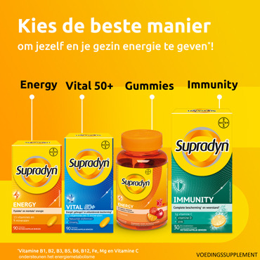 Supradyn Vital 50+ is een multivitamine speciaal ontwikkeld voor volwassenen vanaf 50 jaar die hun vitaliteit en energie willen ondersteunen. Deze formule bevat een uitgebalanceerde mix van vitamines en mineralen, aangevuld met ginseng, wat bijdraagt aan een gezonde energiebalans en vitaliteit.